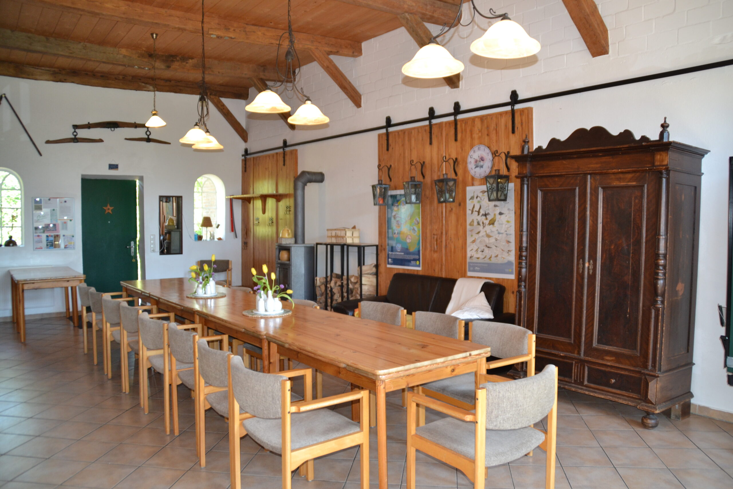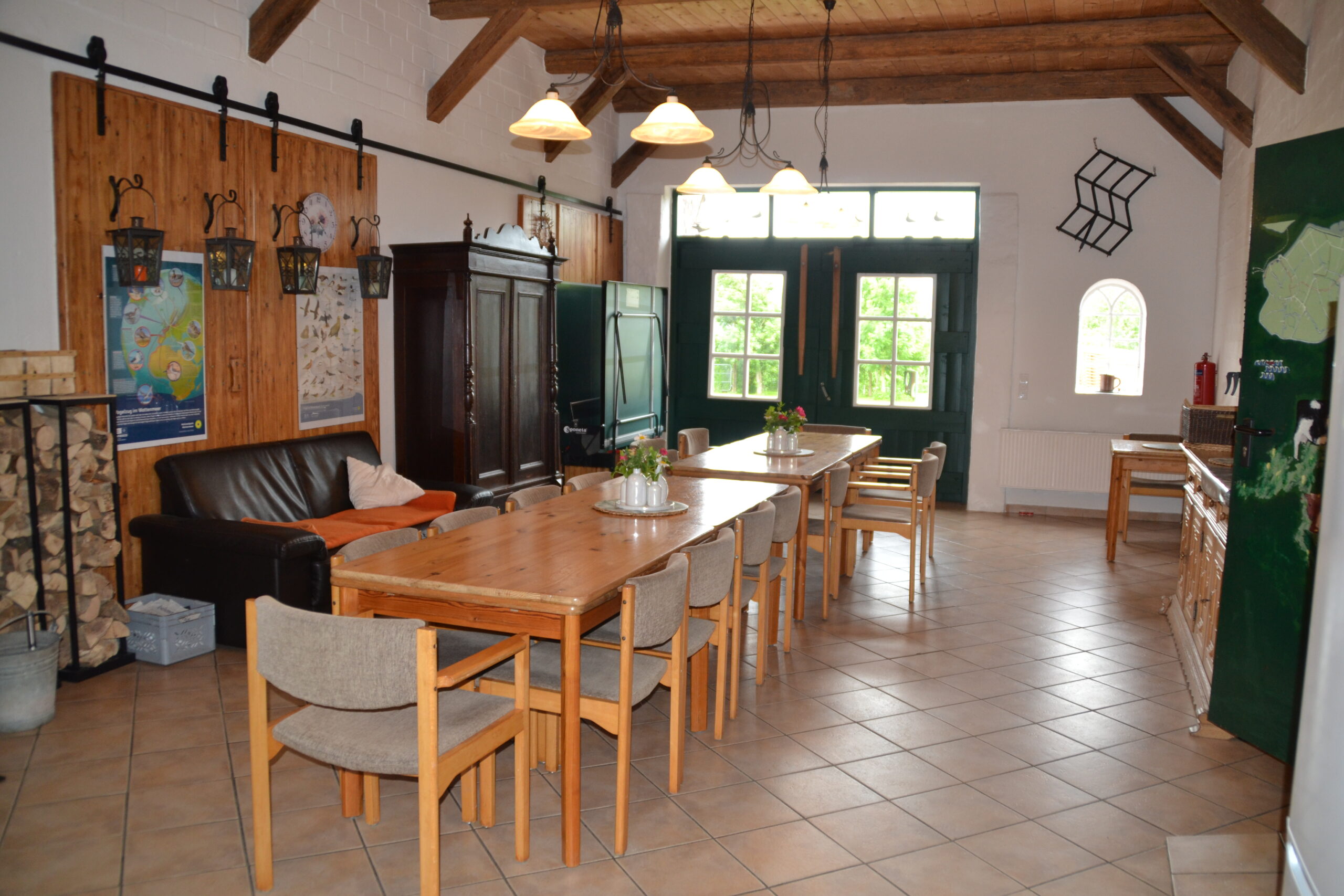 - 60 qm Diele als Speise-, Aufenthalts- und Vortragsraum, mit einer Sitzgruppe (bis 40 Personen), einem zusätzlichen großen Kühlschrank, Mikrowelle, einem Kaminofen und einer breiten Dielentür zur Terrasse