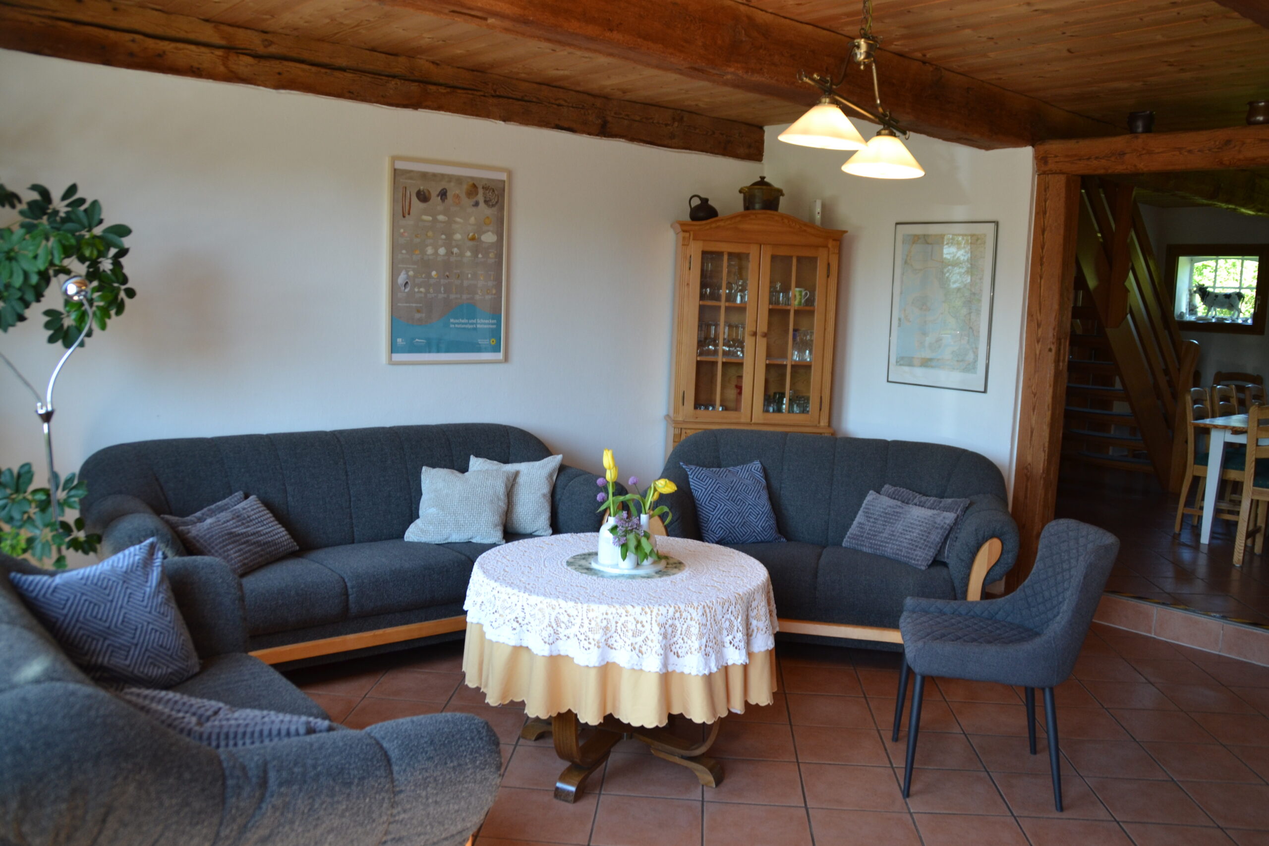 - Wohnzimmer mit alten Balken, neuer Einrichtung und Fernseher (kann auf Wunsch entfernt werden)