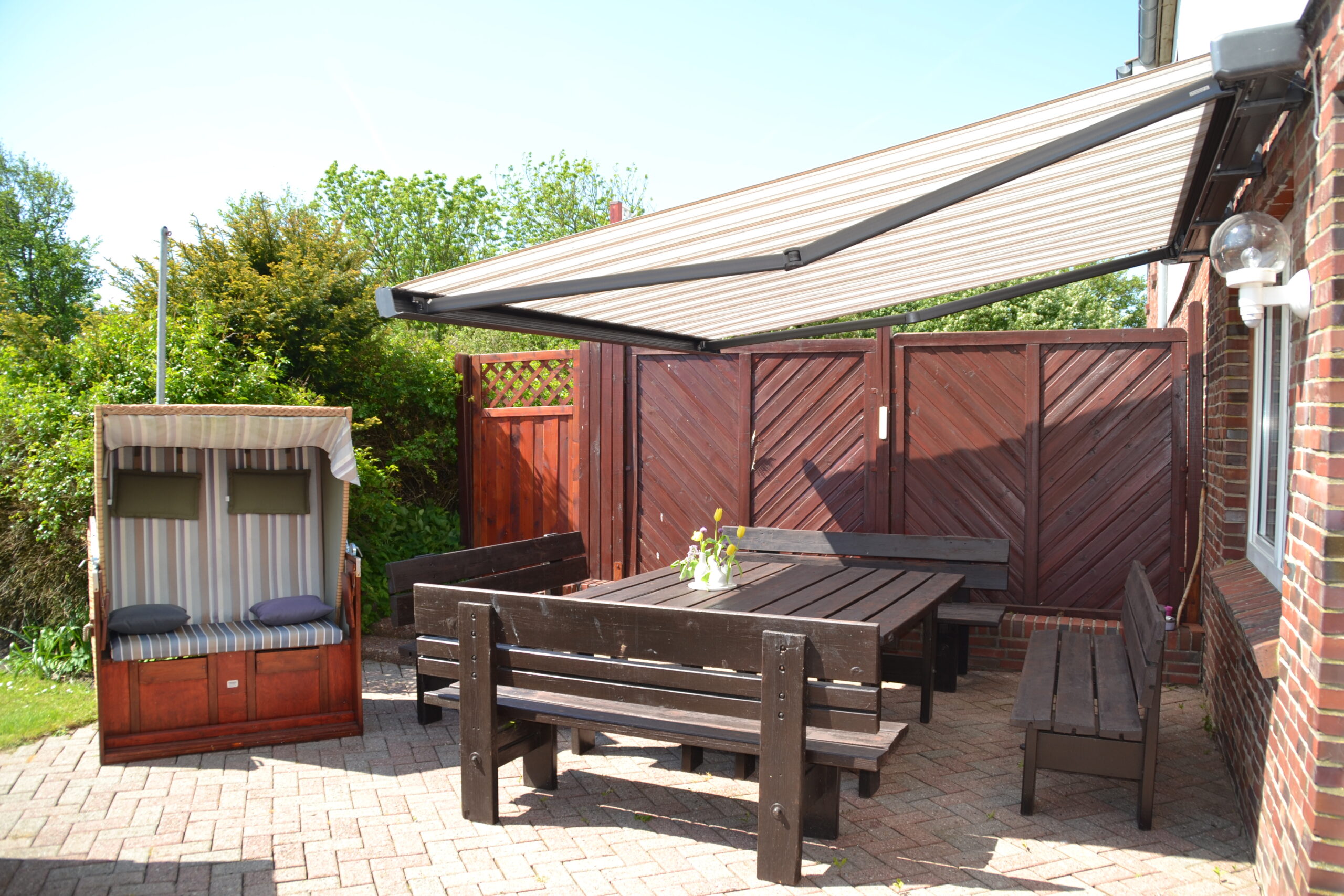 An der Südseite des Hauses befindet sich eine Terrasse (ca. 80 qm) mit Sitzmöbeln aus Holz, einer Markise, 5 Standkörben und einer Sandspielecke für kleinere Kinder.